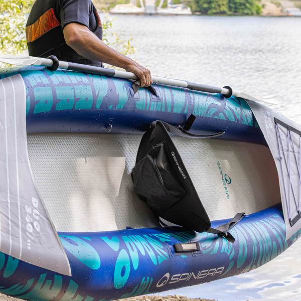 Das Spinera Duo 340 lässt sich schnell aufblasen und ist in ca. 15 Minuten einsatzbereit. Vier Tragegriffe erleichtern das Umsetzen und Zuwasserlassen. Nach der Nutzung kann das Kajak einfach entlüftet, zusammengefaltet und in der mitgelieferten Transporttasche verstaut werden. Durch das geringe Packmaß und das niedrige Gewicht eignet sich das Kajak ideal für spontane Touren und den Transport im Auto.