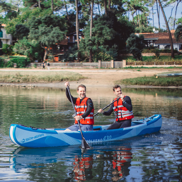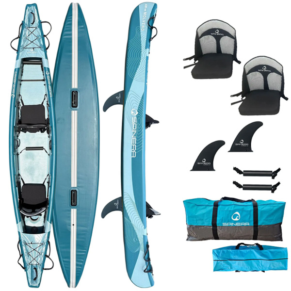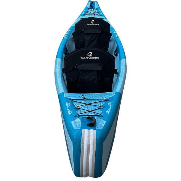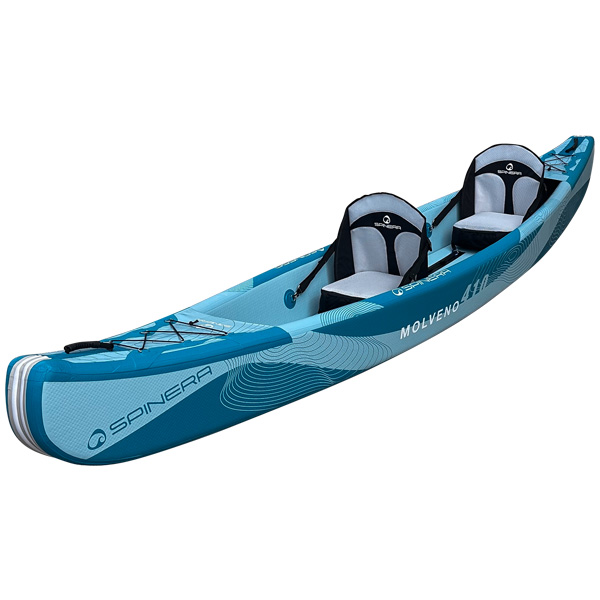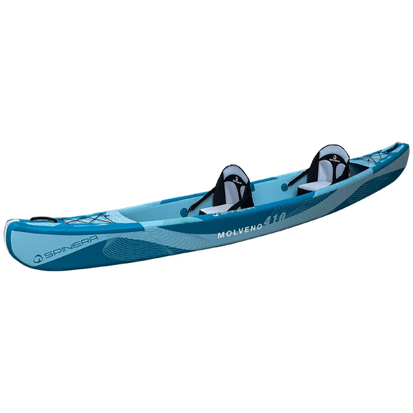 Das Spinera Molveno 430 ist ein aufblasbares Kajak für 1–2 Erwachsene. Die Konstruktion aus Drop-Stitch-Material an Boden und Seiten sorgt für besonders hohe Festigkeit und Formstabilität. Das Kajak ist ideal für längere Touren, Familienfahrten oder den Einsatz zu zweit, kann jedoch auch allein gefahren werden. Eine starke Gummischutzleiste an Bug, Heck und Kiel schützt das Kajak zusätzlich bei Landungen oder in rauem Gelände. Die maximale Nutzlast beträgt 230 kg.