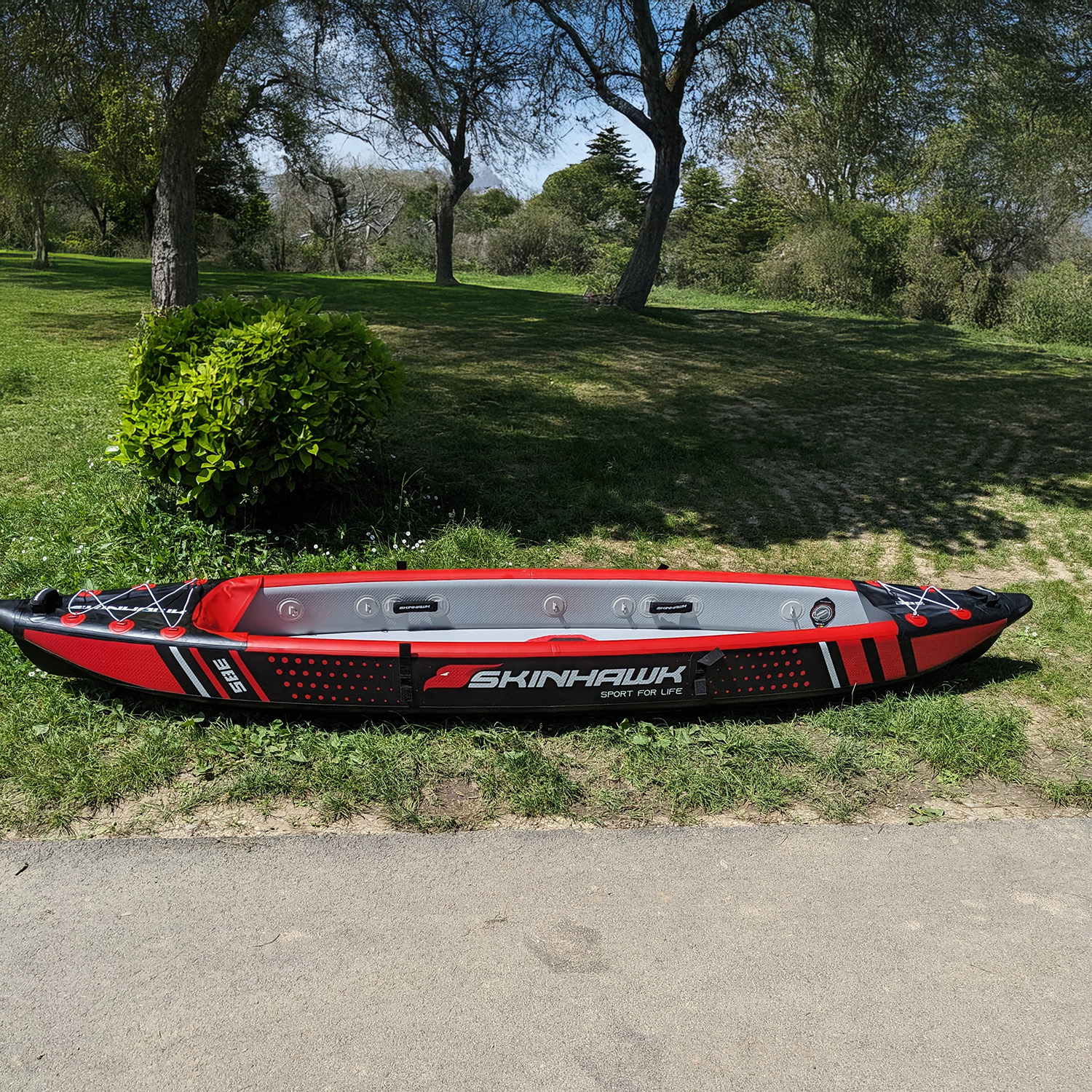 Das SKINHAWK Kajak Premium Full Drop Stitch 385 × 85 cm ist ein aufblasbares 2-Personen-Kajak, das sich an Freizeitpaddler und Tourenfahrer richtet. Durch seine Full-Drop-Stitch-Konstruktion soll das Kajak deutlich steifer und schneller sein als klassische PVC-Schlauchkajaks. Die Kombination aus längerer Bauform, V-förmigem Boden und hoher Tragfähigkeit macht es zu einem interessanten Modell für längere Touren auf Seen, Flüssen oder Küstengewässern. Mit einer Länge von 385 cm, einer Breite von 85 cm und einer maximalen Tragfähigkeit von bis zu 300 kg bietet das Kajak ausreichend Platz für zwei Personen und zusätzliches Gepäck.